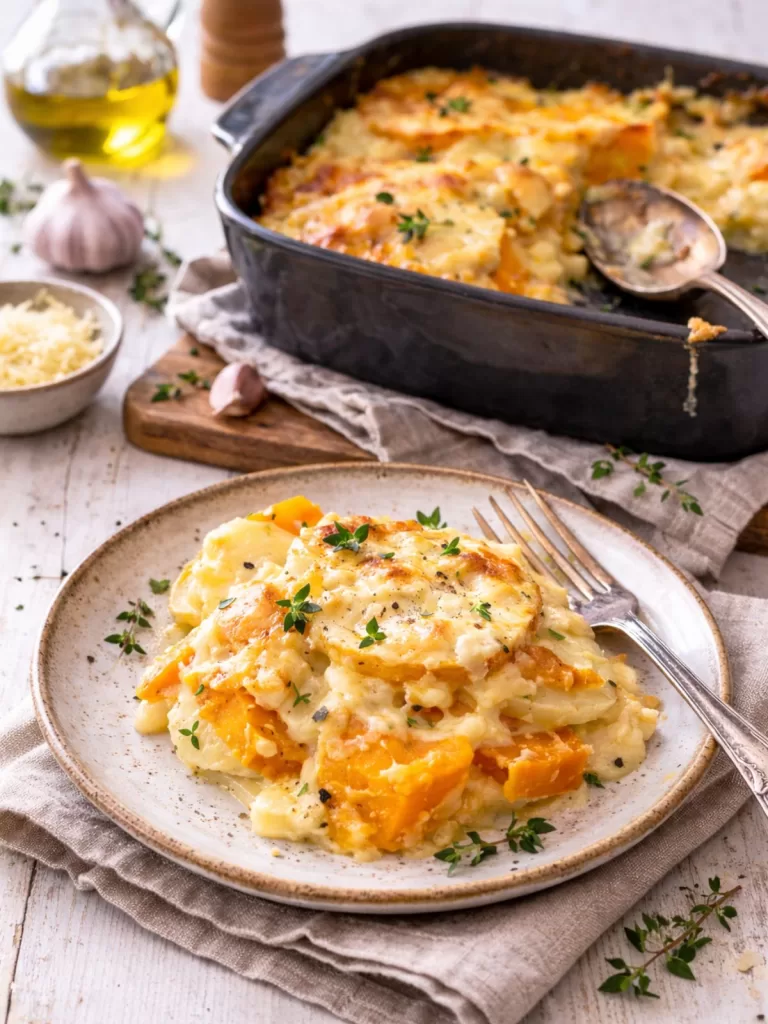 Looking for a side dish that quietly steals the whole show? This Creamy Potato & Pumpkin Bake is exactly that. Think layers of tender potato, sweet pumpkin and a silky, savoury cream sauce, all baked until bubbly, golden and irresistible. Whether you’re hosting a big family dinner or just making a cosy weeknight meal, this bake always gets empty plates and “Can you make that again?” comments.