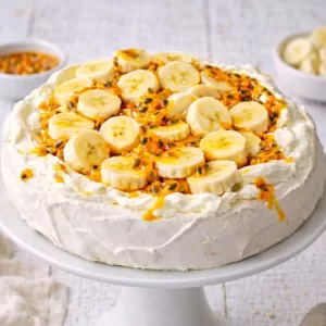 - Before serving, beat cream and icing sugar in a bowl until thickened. Spoon over the top of the cooled pavlova and top with bananas and passionfruit. (or fruit of your choice). Cut into wedges to serve.