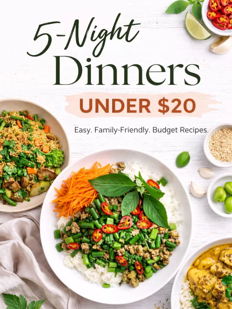 This free guide gives you 5 complete family dinners. Every meal is designed to cost under $20 and feed four people.